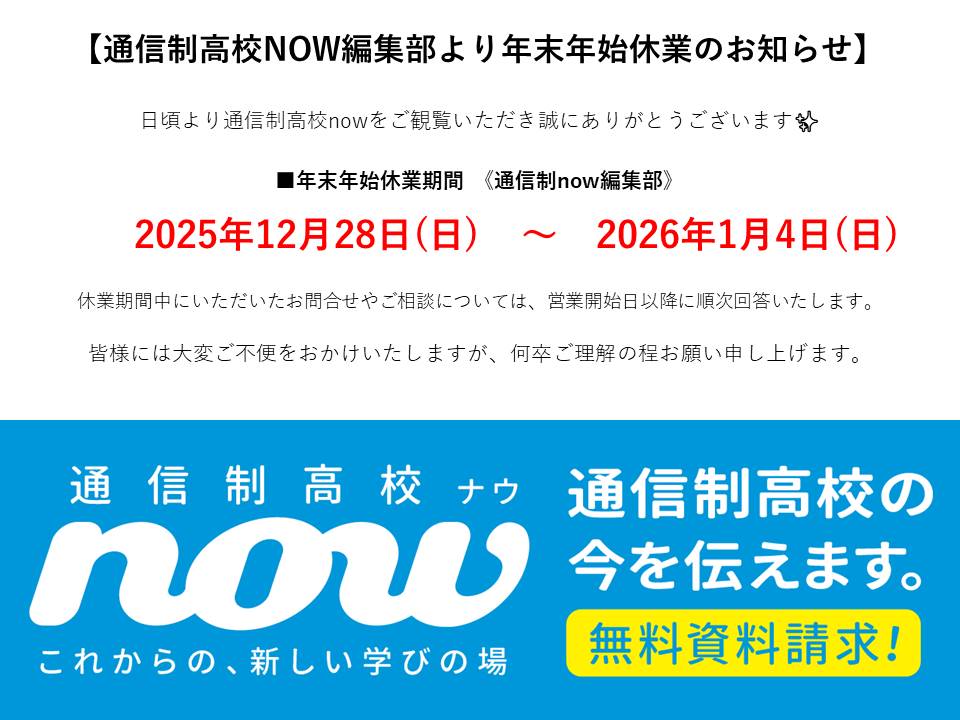 年末年始休業のお知らせ【通信制高校NOW編集部】 2025.12.25 こんにちは通NOW編集部です(^^♪通信制高校NOW事務局では、誠に勝手ながら下記日程を年末年始休業とさせていただきますm(__)m